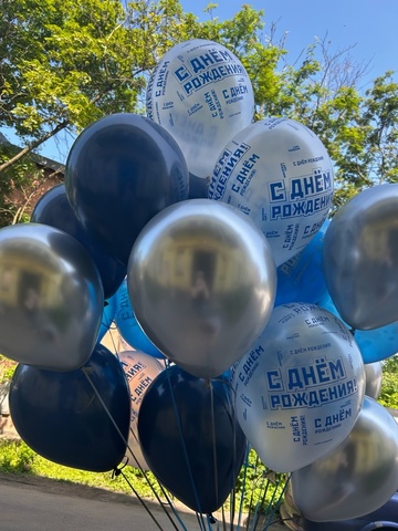 Стильный набор шаров на день рождения мужчине.В наборе тёмно-синего,серебряного,белого и синего цвета с надписями.