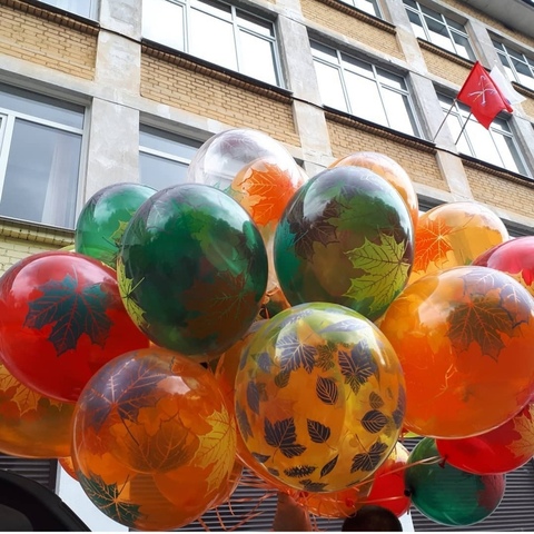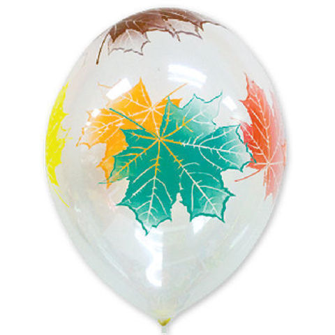 Высококачественный шар из натурального латекса. одного типа - кристалл прозрачные, желтые и оранжевые. Шары с пятисторонним - круговая печать, шелкографическим цветным рисунком рисунком в виде Кленовых листьев на осенюю тематику.Размер шара в надуве 35 см.Время полета воздушного шарика с обработкой спец. полимером типа "hi-float" – до 3х дней.