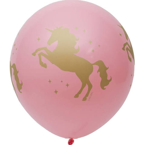 Одноцветный, большой, высококачественный шар из натурального латекса. Шар с четырехсторонним шелкографическим рисунком золотой Единорог на белых шарах.
